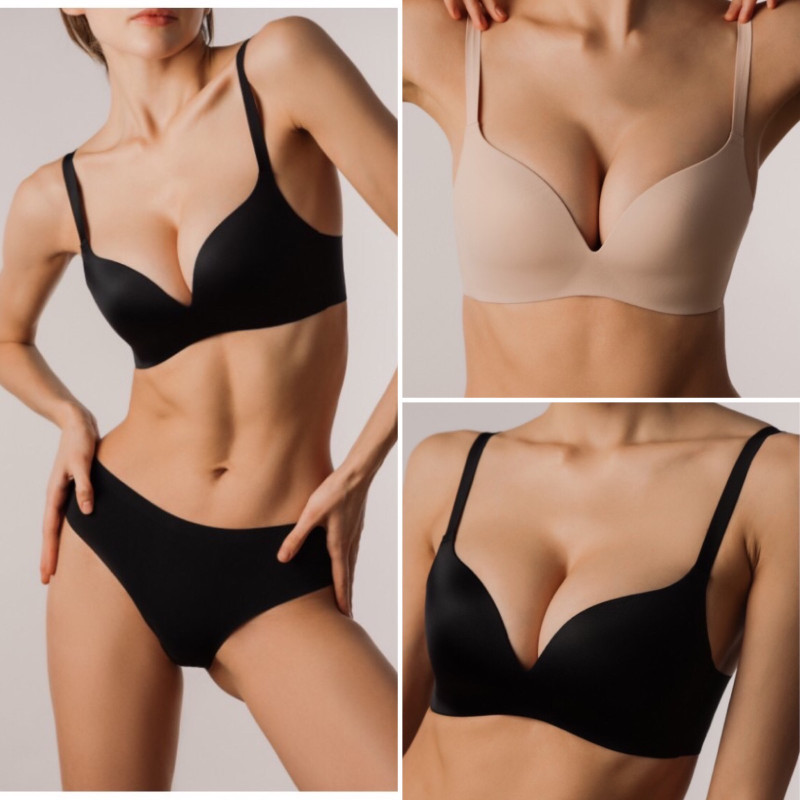 Безшовний бюстгальтер нового покоління із щільного м'якого формованого гіпоалергенного поліаміду. Краї бюстгальтера без швів та резинок – виготовлений за допомогою технології лазерного різання. Чашки - лита цільна конструкція, за рахунок чого ефектно збирає та формує груди до центру навіть за відсутності пуш-ап.